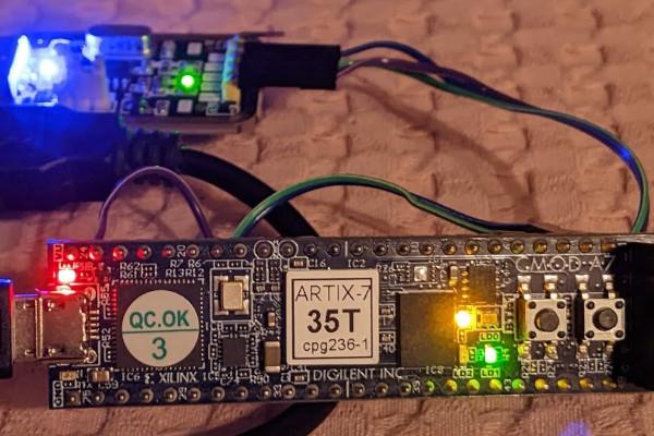 To get to grips with the technology required, Bastian turned to Bruno Levi's Blinker to RISC-V tutorial - but with a twist. "I had enough experience with Amaranth to tackle the tutorial as a practice exercise," he explains. "Instead of using Verilog, I followed Bruno’s tutorial in Amaranth HDL, using the open-source F4PGA (formerly Symbiflow) toolchain and an FPGA board that was not supported in the tutorial (Digilent CMOD A7 with Xilinx Artix 7)."